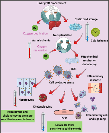 Figure 1. Schematic representation of the cascade of ischemia-reperfusion injury (IRI) events in liver transplantation. The process of liver graft procurement and transplantation involves oxygen deprivation under hypothermic (cold ischemia) and normothermic (warm ischemia) conditions, followed by its restoration. Oxygen deprivation causes damage to the mitochondrial respiration chain and saturation of its reducing capacity. After oxygen restoration post-graft implantation, reactive oxygen species (ROS) are produced both within and outside mitochondria, spreading through intracellular and extracellular spaces, which contributes to cellular dysfunction and cell death. Damage-associated molecular patterns (DAMPs) released from injured cells have strong inflammatory properties, attracting innate and adaptive immune cells and creating a pro-inflammatory environment affecting various liver cell types: hepatocytes, cholangiocytes, and sinusoidal endothelium. The intensity of inflammatory responses depends on the type of ischemia (cold versus warm), its duration, the methods of restoration, and the biological features of the liver graft (such as age, steatosis, fibrosis), leading to different clinical outcomes. Liver cells exhibit varying levels of sensitivity to ischemia-reperfusion injury (IRI), with hepatocytes and cholangiocytes being more susceptible to warm ischemia than liver sinusoidal endothelial cells (LSEC). The activation of the innate immune response triggered by IRI initiates adaptive (antigen-specific) immune reactions, which may explain the higher rates of post-transplant acute rejection seen in some clinical studies. LSEC: liver sinusoidal endothelial cell; ROS: reactive oxygen species.