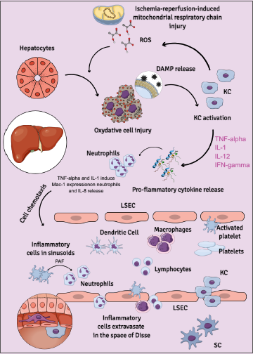 Most initial changes in anoxic hepatocytes occur within the mitochondria (Figs. 1,2) 19. The absence of O2 immediately disrupts electron flow, causing the respiratory chain to become reduced. As mitochondria can no longer accept electrons from substrates, there is a decline in pyridine nucleotides, leading to an increased intracellular NADH/NAD+ ratio. The disruption of oxidative phosphorylation leads to cellular ATP depletion, accelerated glycolysis, increased lactate production, and alterations in ion balance (H+, Na+, and Ca2+), all of which severely harm hepatocytes. Reperfusion injury primarily results from the generation of toxic reactive oxygen species (ROS) when oxygen is reintroduced to ischemic tissues. ROS are produced from both intracellular and extracellular sources, with mitochondria being the primary source in liver cells 19. In turn, ROS and toxins accumulated in mitochondria during oxygen deprivation are released upon reoxygenation, leading to the breakdown of cellular organelles and the production of DAMPs, such as high-mobility group box-1 protein (HMGB-1). These DAMPs promote inflammation by activating antigen-presenting cells (APCs), including dendritic cells, resident immune cells, and Kupffer cells (KC) 19.