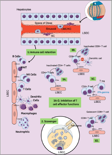 Figure 3. Schematic representation of the immunomodulatory functions of liver sinusoidal endothelial cells (LSEC). 1) LSECs help retain inflammatory and immune cells in the liver sinusoids, creating an environment for both innate and adaptive immune responses; 2) LSECs exhibit high scavenger activity via their Toll-like receptors (TLR), aiding in the clearance of intestinal and blood-borne pathogens and molecules; 3A-D) LSECs display unique modulatory functions by: A) inactivating CD4+ T cells through the interaction of the LSECtin receptor with CD44 (on CD4+ T cells); B) diverting the activation of CD8+ T cells from engaging with antigen-presenting cells (APC), such as dendritic cells (DC), via the interaction of the LSECtin receptor with lymphocyte function-associated antigen-1 (LFA-1); C) inducing the formation of antigen-specific regulatory CD4+ T cells by the interaction of MHC-II-restricted antigens with the T cell receptor complex (TCR) in the presence of LSEC-produced interferon-gamma, Notch signaling activation, and the absence of IL-12 co-stimulation (which is poorly expressed on LSECs); D) inducing quiescence in CD8+ T cells due to the combined effect of low blood flow in the sinusoidal space. In the unique microenvironment of liver sinusoids, antigen-specific, MHC-I-restricted cross-presentation by LSECs, in the presence of B7H1-to-programmed death-1 receptor (PD-1) co-stimulation, triggers the generation of quiescent CD8+ T cells. Therefore, LSECs play a vital role in orchestrating the liver microenvironment’s innate and adaptive immune responses against intestinal and blood-borne alloantigens and pathogens. IFN: interferon; KC: Kupffer cells; LFA-1: lymphocyte function-associated antigen-1; LMC: liver monocytic cells; LSEC: liver endothelial sinusoid cells; MAIT: mucosa-associated invariant T cells; NK: natural killer; PD-1: programmed death-1; SC: stellate cell; TCR: T-cell receptor complex; TLR: toll-like receptor.