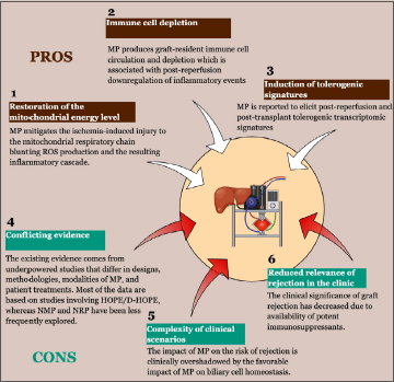 Figure 4. Summary of pros and cons of the impact of machine perfusion on the risk of acute rejection of the liver graft. Abbreviations: D-HOPE: dual-HOPE; HOPE: hypothermic oxygenated perfusion; MP: machine perfusion; NMP: normothermic machine perfusion; NRP: normothermic regional perfusion.