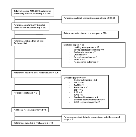 Comparative economic studies were retrieved using the following search terms: patient/disease, i.e., "hepatocarcinoma", "hepatoma", "hepatocellular carcinoma", "HCC", AND intervention comparators, i.e., "treatment", "management", "ablation", "radiofrequency", "thermal", "microwave", "surgery", "resection", "liver resection", "transplantation", "liver transplantation", "embolization", "chemoembolization", "transarterial therapy", "TACE", "transarterial chemoembolization", "HAIC", "systemic therapy", "VEGF", "VEGF inhibitors", "sorafenib", "lenvatinib", "regorafenib", "cabozantinib", "donafenib", "immunotherapy", "immune checkpoint inhibitors", "atezolizumab", "bevacizumab", "nivolumab", "durvalumab", "tremelimumab", "pembrolizumab", "ipilimumab", "toripalimab", "camrelizumab", "rivoceranib", "tislelizumab", "sintilimab", "sunitinib", "brivanib", "STRIDE", AND outcome, "cost", "economic", "resources", "financial", "cost analysis", "cost-effectiveness", "cost-utility", "cost-benefit", "saving", "acceptability".